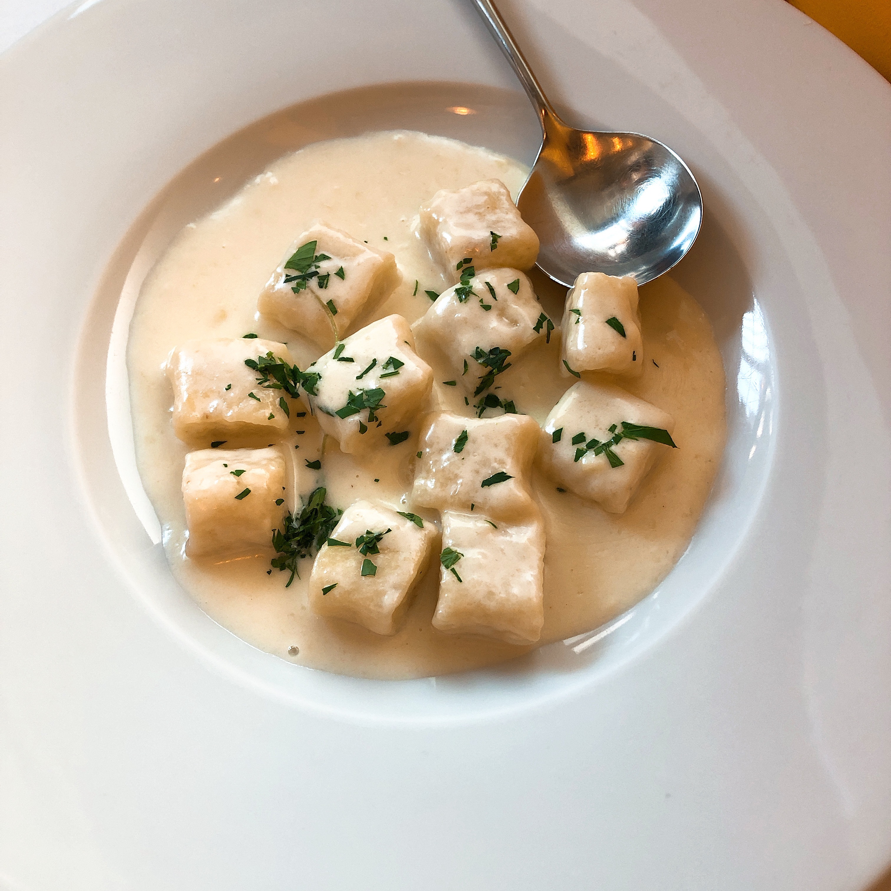 다음은 폰티나 치즈를 곁들인 홈메이드 크림소스 뇨끼예요.