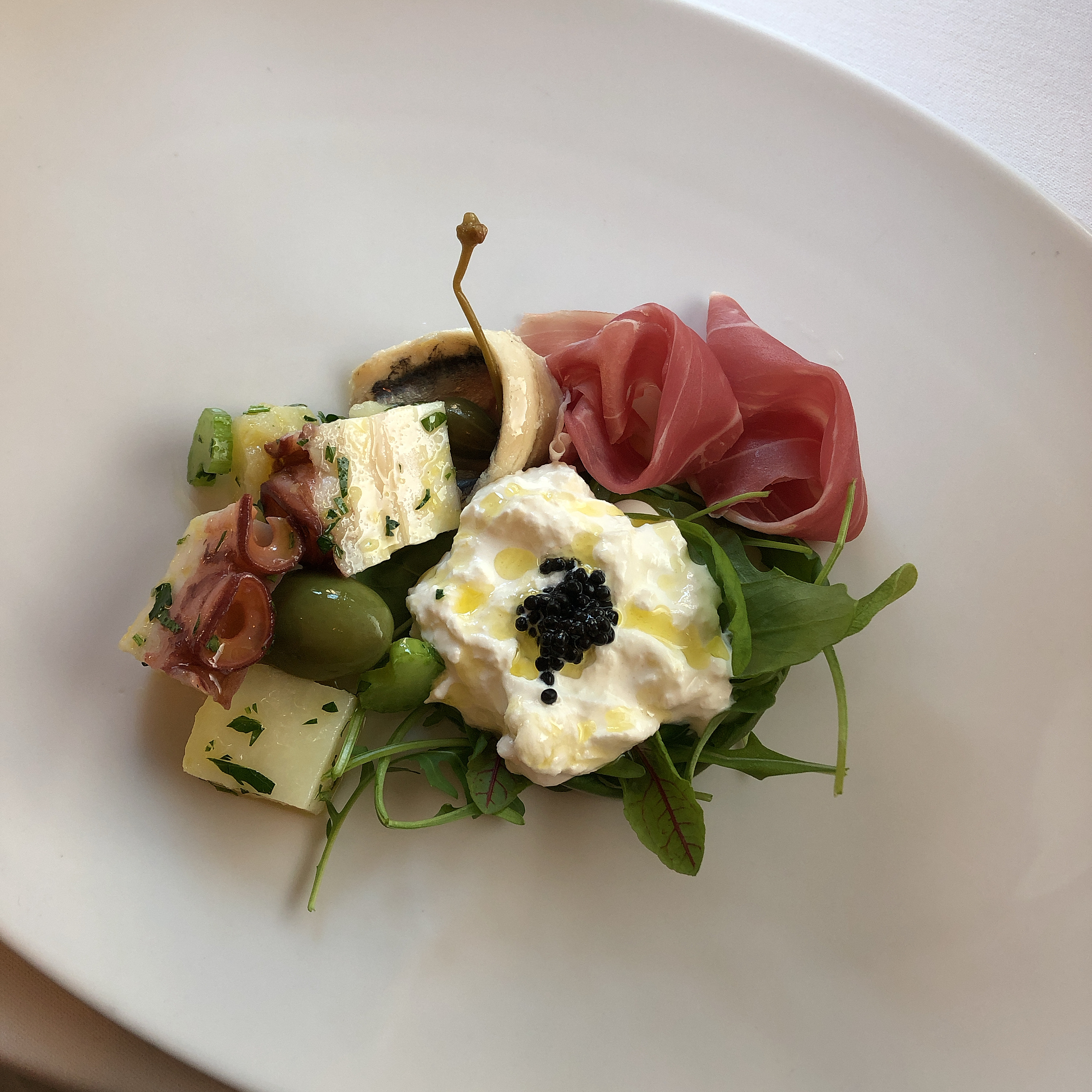 신선한 부라따 치즈와 루꼴라, 산 다니엘 프로슈토, 까스뗄베뜨라노 올리브, 점보 케이퍼, 동해산 돌문어에 엄선된 엑스트라 버진 올리브오일을 곁들인 전채요리!